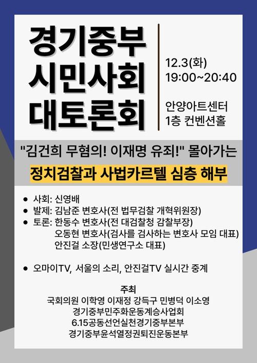 경기중부 시민사회가 12월 3일 안양아트센터 컨벤션홀에서 개최한 ‘김건희 무혐의, 이재명 유죄로 몰아가는 정치검찰과 사법카르텔 심층 해부’ 토론회에서 윤석열 사단은 쿠데타를 일으켜 정권을 잡았다는 주장이 나왔다.