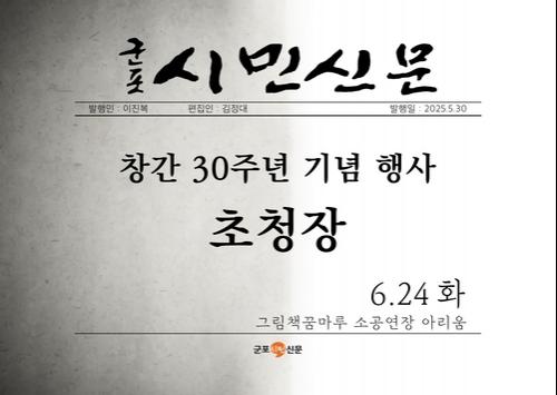 군포시민신문, 창간 30주년 기념식 6월 24일 ··· '시민과 30년, 100년을 향해''어른 김장하' 김주완 기자 강연, 아름다운시민 및 6행시 시민공모전 수상작 시상시민 참여 언론, 지역정론지 군포시민신문이 2025년 6월 24일(화) 1부 17시 30분 / 2부 19시, 그림책꿈마루(군포시 청백리길 16) 소공연장 아리움에서 창간 30주년 기념행사를 개최한다.