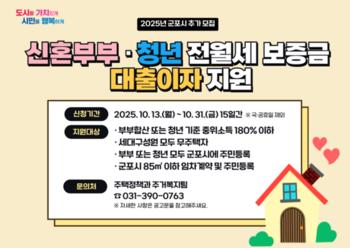 군포시는 신혼부부와 청년들의 주거비 부담 경감과 안정적인 거주환경을 위해 추진 중인 ‘군포시 신혼부부 및 청년 전월세 보증금 대출이자 지원사업’의 지원 기준을 대폭 완화하고 이에 따라 추가 지원 대상자를 모집한다고 10월 10일 밝혔다.