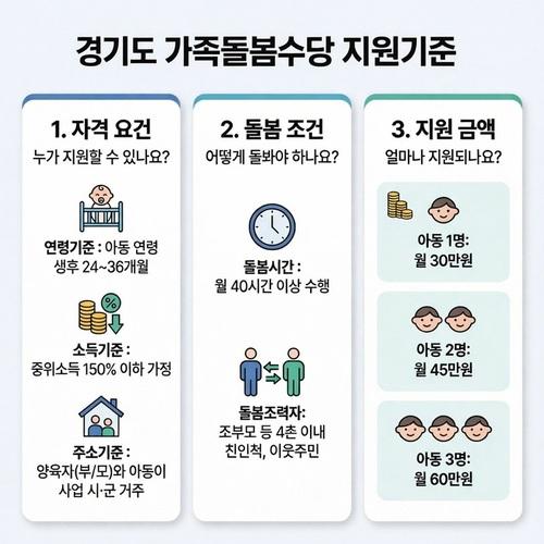 경기도, 2026년 가족돌봄수당 14에서 26개 시군 확대 시행도내 생후 24~36개월 아동 대상. 월 최대 60만 원 지급경기도 가족돌봄수당 사업 참여 시군이 지난해 14개에서 올해 26개 시군으로 늘어남에 따라 더 많은 도민들이 돌봄사업 혜택을 받게 됐다.
