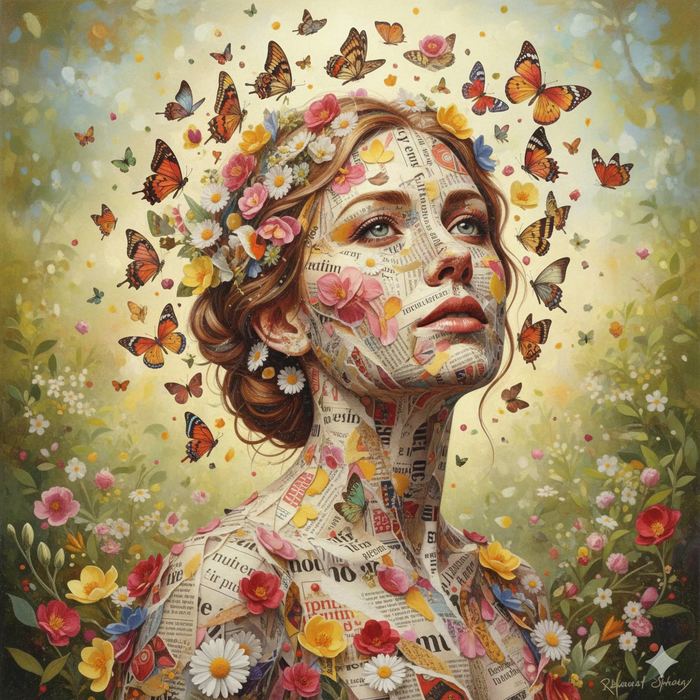 작가노트 기억의 파편이 꽃과 나비로 다시 피어나는 장면을 통해감정과 기억의 층위를 시각적으로 표현한 작품이다.신문지 조각, 종이 질감, 꽃의 형상들은과거의 경험과 현재의 감정이 겹겹이 쌓여새로운 존재를 만들어 내는 과정을 상징한다.