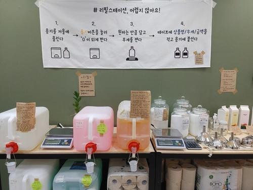 Q3. 세 가지 실천강령이라... 실천하는 모습을 잠시 보여 주실래요 A3. 입구에는 손님들이 기부한 장바구니와 종이가방들이 있고, 그 옆에는 종이팩 그리고 색깔별로 분리한 폐플라스틱 병뚜껑 수거함들이 있습니다. 장바구니나 종이가방은 매장에서 직접 활용하고, 폐플라스틱 등은 수거업체에서 정기적으로 수거해갑니다. 맞은편 탁자 위에는 군포의 채식 지도와 기후, 동물권 관련 책들이 가지런히 놓여 있어서 언제든지 대출 열람이 가능합니다. 미니도서관치고는 책이 너무 적은 게 흠이지만요(웃음). 안으로 들어오셔서 가장 먼저 만나는 리필 스테이션에는 각종 친환경 주방세제와 세탁세제들이 말통 째 놓여 있지요. 여기 코너는 손님들이 손수 가져오는 용기에 필요한 양만 계량하여 담아갈 수 있습니다. g당 5~15원 정도이니 가격은 좀 비싼 편이지만 성분엔 만족하실 겁니다. (안쪽으로 이동하며) 그 옆으로 각종 생활용품, 수세미, 비누, 칫솔, 치실, 손수건, 마스크 등등 120여 가지의 친환경 상품이 진열되어 있습니다. 그런데 다른 매장과 좀 다른 점이 느껴지지 않나요? 다른 느낌은 바로 포장이 아예 없거나 최소한의 포장으로 진열되어 있다는 점이지요.