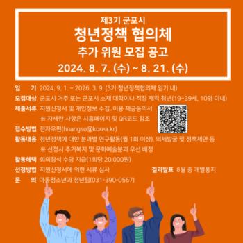 군포시는 청년의 요구를 반영한 정책의제 발굴과 실현 등을 위해 ‘제3기 청년정책협의체’ 위원을 추가로 공개 모집한다.