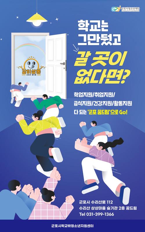 군포시학교밖청소년지원센터는 학업 중단 청소년(만9세~24세) 누구나 이용 가능하며, 모든 프로그램은 무료로 진행된다.