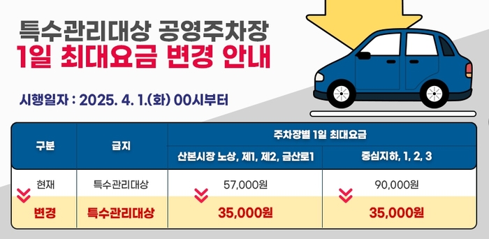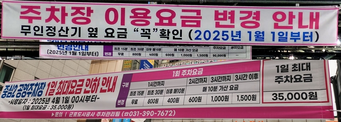 군포 공영주차장 요금, 시민 불만쇄도로 1일 최대 요금 9만 원에서 3만5천 원으로4월 1일부터 적용, 누진제는 지속군포시는 4월 1일부터 중심 1·2·3·지하 공영주차장의 1일 최대 요금을 기존 9만 원에서 3만 5천 원으로 조정한다고 밝혔다. 누진제는 지속한다는 입장이다.
