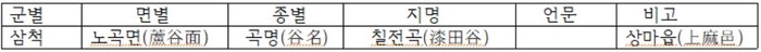 【옷박-골】 [칠전곡, 의암곡] 강원도-삼척군-노곡면-상마읍리 : 산중턱 서북쪽에 있는 마을 (한국지명총람, 1960년대)