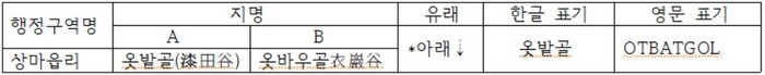 한자로 봐서도 ‘옻밭’이 맞는데 이미 마을에서도 당초의 유래를 잊어버린 듯 ‘옷바우/衣巖’도 나란히 올라 있다. 이밖에도 ‘옷박골’로 쓰는 곳은 대구광역시 달성군-하빈면-봉촌동, 강원(옛 함경)도-원산시-영삼리가 있다. 또 다른 표기로서 아래의 예를 들 수 있다.