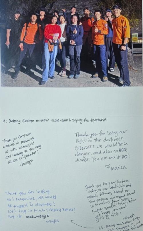 1월 9일 경기도북부소방재난본부에 따르면 지난해 11월 북한산에서 조명 장비 없이 야간 하산을 시도하다 조난을 당한 싱가포르 국적 관광객 4명이 지난달 말 고양소방서에 감사 편지를 보냈다.