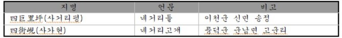 20세기 들어와서도 줄곧 그렇게 써왔으니 글쓴이도 그렇게 듣고 써왔다. 그런데 모든 소리를 한자로만 적으려는 선조들은 열심히 공들여 한자로 옮겨 썼다. 네(넷)는 뜻 ‘사(四)’로 바꾸고 토박이말인 ‘거리’는 소리만 빌려 써서(音借, 音譯) 몇 가지 시안(試案)을 선보였다. ‘윗말은 번역하고 아랫말은 그냥 두는(譯上不譯下) 식이다. 『조선지지자료, 경기도』편을 보자.