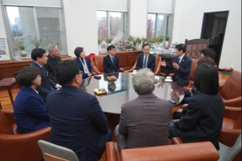 이학영 국회부의장과 군포시 시·도의원들이 함께 김윤덕 국토교통부 장관과 11월 27일 면담을 갖고, 군포시 관내 경부선(금정역·군포역·당정역)·안산선(산본역·수리산역·대야미역) ‘철도지하화 통합개발 종합계획’ 반영의 필요성을 적극 건의했다.