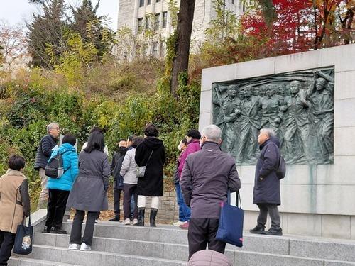 4.18기념탑은 앞서 설명한 대로 1960년 4.19혁명을 촉발시킨 4.18 고려대생 의거를 기념하여 1년 뒤인 1961년 4월 18일 세운 탑으로 지금도 고려대생들의 긍지로 여겨지는 기념탑이다. 캠퍼스로 들어서며 상품이 걸린 퀴즈를 내었는데, 고려대의 상징동물은 호랑이, 그러면 상징교목은 뭔지를 묻자 아무도 답을 못했다. 다섯 개의 예(참나무/소나무/잣나무/단풍나무/대나무)를 제시하고도 몇 번을 찍은 후에야 정답이 나왔다. 이 글을 읽는 여러분도 한번 맞추어 보시라. [정답은 맨 뒤에] 교내에 있는 우당기념관은 누구를 기념하는 곳이냐는 질문에는 선뜻 ‘이회영’이라는 답이 나왔다.
