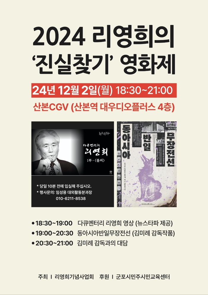 2024 리영희의 ‘진실찾기’ 다큐영화제 12월 2일 열려산본CGV '동아시아반일무장전선' 상영 이어 김미례 감독과의 대담