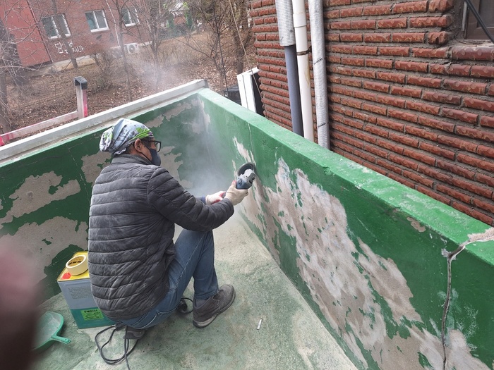 진 대표가 강조하는 방수의 핵심은 원인 파악과 기초 공정이다. 먼지 제거·균열 확인 → 하도(접착) → 실란트·퍼티(크랙 보수) → 중도 1·2차(총 3 ㎜) → 상도 마감까지 “절차를 건너뛰면 몇 해 못 가 하자가 난다”는 설명이다. 습도·기온을 고려해 혹한·혹서는 작업을 미루고, 시공 후엔 매년 무상 점검을 실시한다.